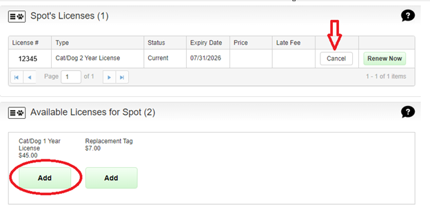 If you had a 2-year license, you will need to cancel the 2-year license and purchase a 1-year license. We recommend making a note of your Person # from the "My Info" section prior to cancelling in the event you need to log back in before completing the transaction. Please click the Cancel button, and then select the Cat/Dog 1 Year License by clicking the Add Button below.