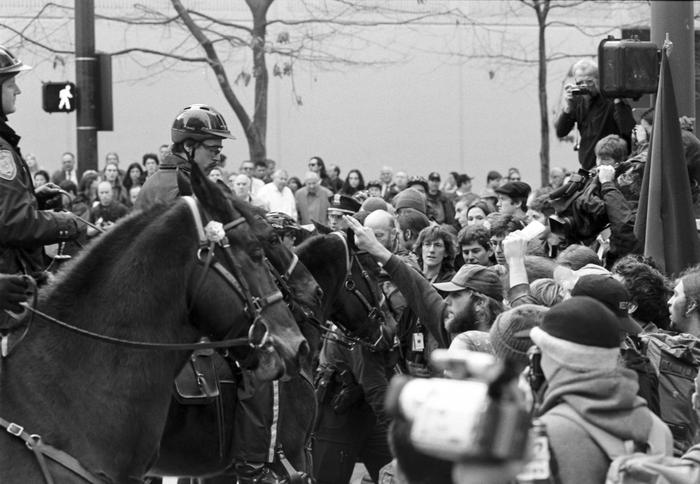 Paul Richmond. "Bringing in an Undemocratic Institution brings an Undemocratic Response." Seattle, July 2000. Locations: Seattle Municipal Archives 4917. Seattle Public Library 364.14309 R415B.