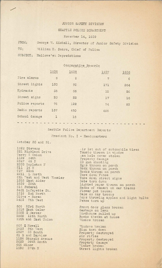 Each year they would create a report titled "Hallowe'en Depredations" that documented problems that had been reported on that year's holiday. The top section of the reports compared numbers of false fire alarms, broken streetlights, stolen street signs, and the like with the previous year's totals. The following section contained a list of each incident reported to the police in the current year, including times and locations.