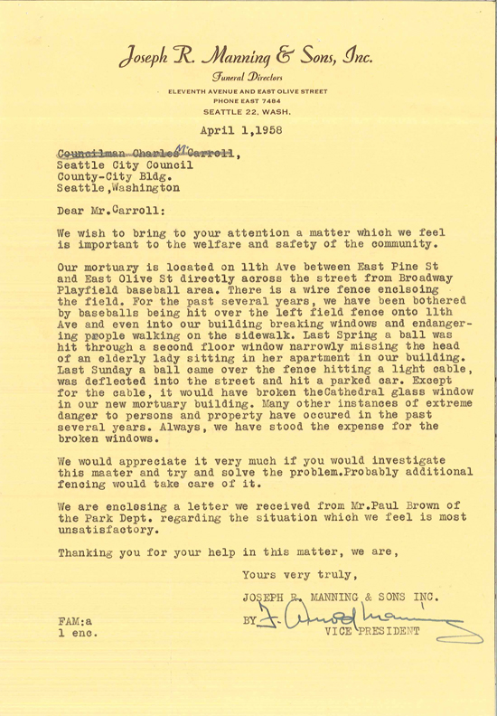 Almost forty years later, a funeral parlor located across from Broadway Playfield (now Cal Anderson Park) complained that baseballs were wreaking havoc on their property and endangering people on the sidewalk. Their letter stated, "Last Spring a ball was hit through a second floor window narrowly missing the head of an elderly lady sitting in her apartment in our building. Last Sunday a ball came over the fence hitting a light cable, was deflected into the street and hit a parked car. Except for the cable, it would have broken the Cathedral glass window in our new mortuary building."