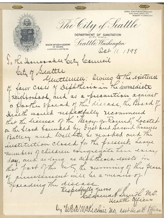 Three years after the scarlet fever epidemic, diphtheria hit the city. Looking for ways to halt the spread of the disease among Seattle's children, the Board of Health asked that a carousel in Belltown be closed indefinitely. The carousel was located at First and Wall, near where four cases of the illness had recently been diagnosed. In a letter to City Council, the Board noted that "large numbers of children congregate here every day, and as long as diphtheria exists in that part of the city, the running of this place of amusement will be a means of spreading the disease." The ride was indeed shut down, and several months later, after petitioning the city, the carousel's operator was credited his license fee for the period of time he was ordered to be closed.