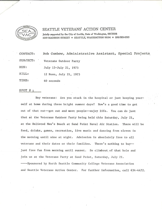The Seattle Veterans Action Center (SEA-VAC) was established in 1971 to provide readjustment assistance to veterans, especially minority, disadvantaged and disabled Vietnam War veterans. The agency's work included employment assistance, benefit counseling, and referrals to services. In the early 1970s, the organization wrote a number of public service announcements to air on local radio stations. The spots were aimed both at veterans, to advise them of services available to them, and at the general public, to raise awareness of the needs of veterans in their community.