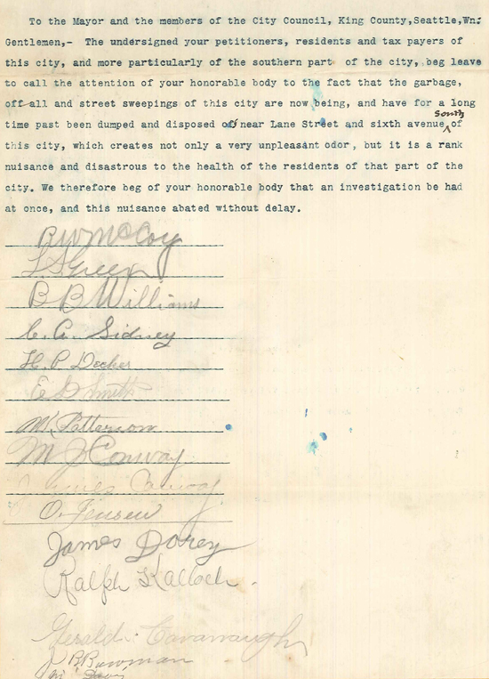 Disposal of garbage was a problem in Seattle's early days, as the city's population was growing while needed infrastructure was still evolving. In 1897, citizens living near a dump at 6th and Lane sent a petition to the Council stating that the site was "an intolerable nuisance, which is incompatible with the health and comfort of those residing in the vicinity."