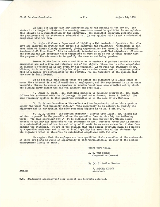 During the 1950s Red Scare, Seattle city employees were required to sign oaths attesting that they were not "a subversive person," (i.e., a communist). A 1951 memo found in the Civil Service Commission Subject Files addressed the particulars of six employees who had not strictly followed instructions on the loyalty oath.