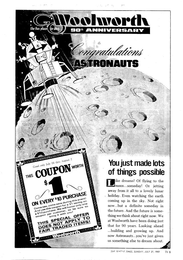 Some Seattleites, along with others throughout the US, enjoyed an extra holiday in July 1969 thanks to the space program. President Nixon, while not having legal authority to declare a national holiday, did issue a proclamation declaring a "National Day of Participation" in honor of the moon landing. The proclamation read, in part: