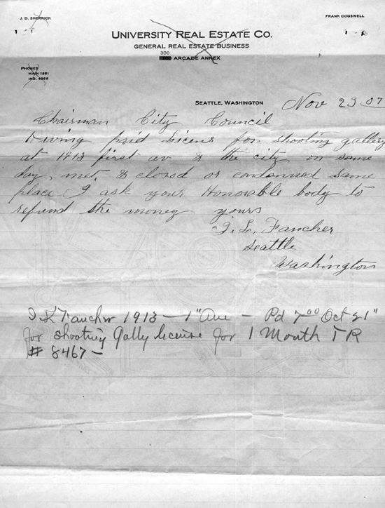T.S. Fancher wrote to request a refund of a license fee he paid for an amusement on First Avenue on the same day that it was condemned for the Exposition. The money was refunded.