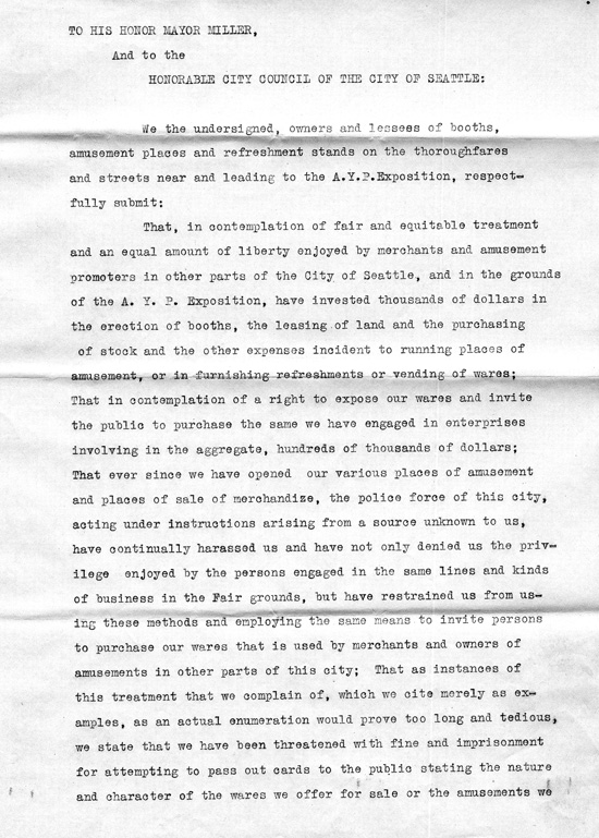 A petition was submitted in June 1909 from "owners and lessees of booths, amusement places and refreshment stands on the through fares and streets near and leading to the AYP Exposition" complaining of harassment by the police force "from a source unknown to us." The merchants wanted their right to pass out cards, play a phonograph, and "cry their wares and attract the buying public" just as the vendors inside the Exposition were able to do. The Council took no action on that petition. A second petition was filed a few days later from vendors who also complained that the police would not allow them to sell their wares on the streets and avenues leading to the Exposition. City Council denied their petition for greater leniency.