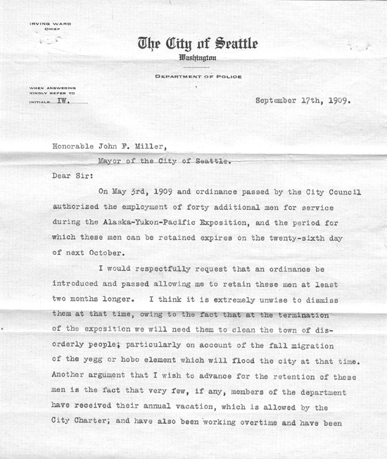 The Chief of Police requested that the additional police force be retained for at least two months after the end of the Exposition because "we will need them to clean the town of disorderly people; particularly on account of the fall migration of the yegg or hobo element which will flood the city at that time."
