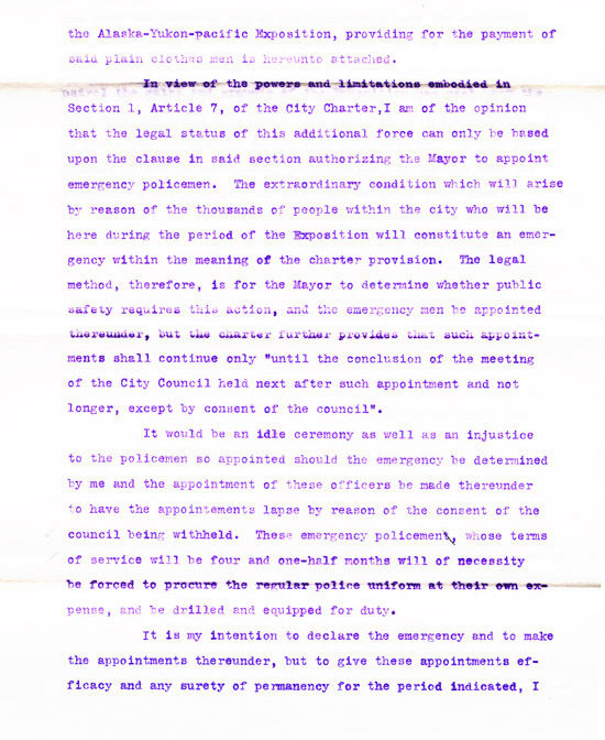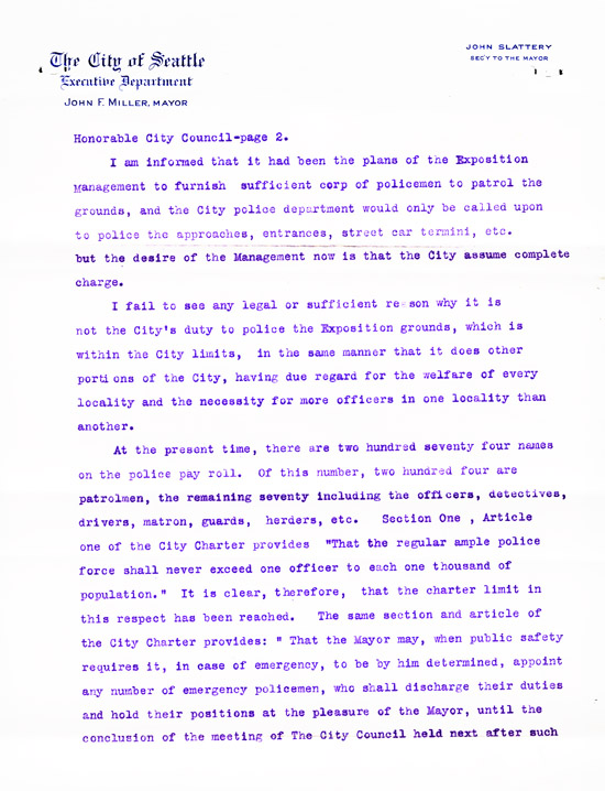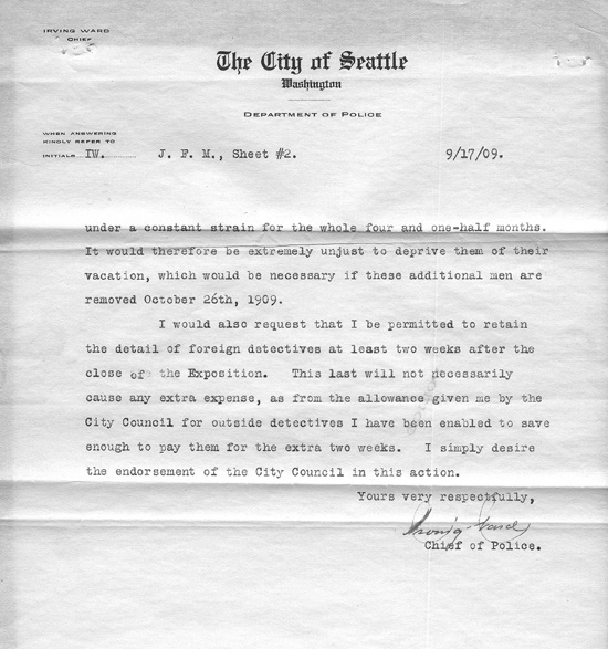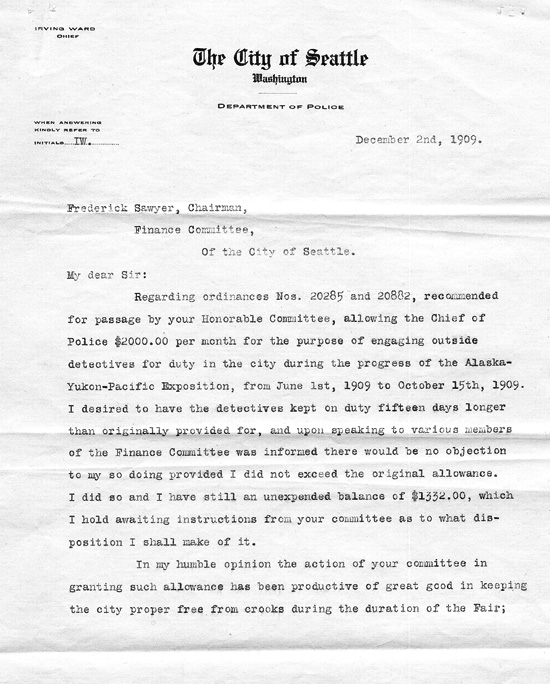 He wrote again on December 2, 1909, to thank the chairman of the Finance Committee for approving his request for additional detectives during the Exposition. He stated that the city was thus kept "free from crooks during the duration of the Fair; and Seattle has set a mark, that has been freely and extensively commented on in police circles all over the country, for the almost entire absence of crime." He provided a statement of expenditures which listed payments to the detectives, their names, and from where they were detailed. Several were from Pinkerton's, while others were from Denver, San Francisco, Kansas City, and St. Paul.
