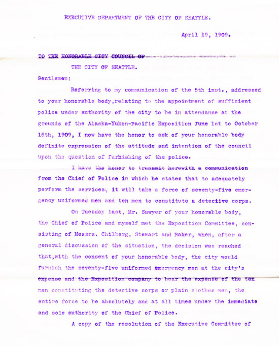 Although funding was provided at the state level, much of the financial burden for the Exposition fell to the City of Seattle. Many city departments worked tirelessly before the AYPE to secure funding or put personnel in place to ensure the fair's success. These departments expressed their concerns, ideas, and requests to City Council and the Mayor through various communications and reports.