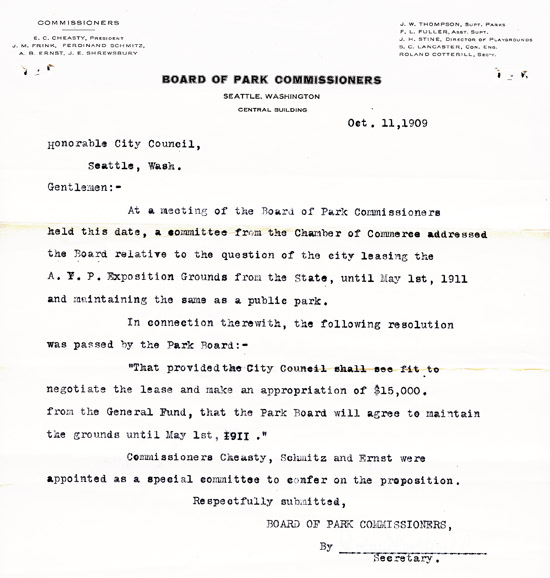 The University of Washington was appreciative of the City's support for the Exposition. The Board of Park Commissioners noted in its minutes that it received a letter from the Board of Regents extending thanks for "the efficient manner and friendly spirit manifested in the care of the portion of the campus cared for by the board during the past summer. This being the site of the A.Y.P. Exposition."