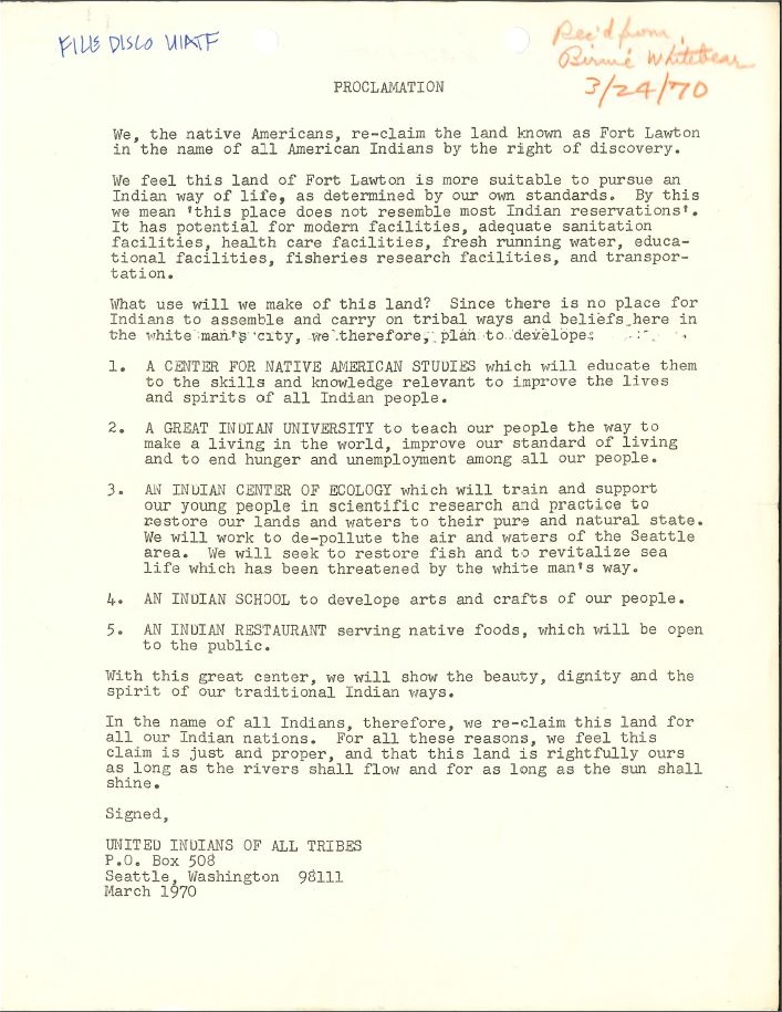 A copy of the protest proclamation read at the takeover was delivered to city offices by Bernie Whitebear on March 24. The proclamation outlined the reasons and intent behind the occupation and began by invoking the so-called Doctrine of Discovery which had been used by Europeans for hundreds of years to take possession of land already occupied by Indigenous peoples: "We, the native Americans, re-claim this land known as Fort Lawton in the name of all American Indians by the right of discovery." The proclamation continued on to state that the land would be used to develop a center for Native American studies, an Indian university, an Indian center for ecology, an Indian school, and an Indian restaurant. It concludes, "We feel this claim is just and proper, and that this land is rightfully ours as long as the rivers shall flow and for as long as the sun shall shine."