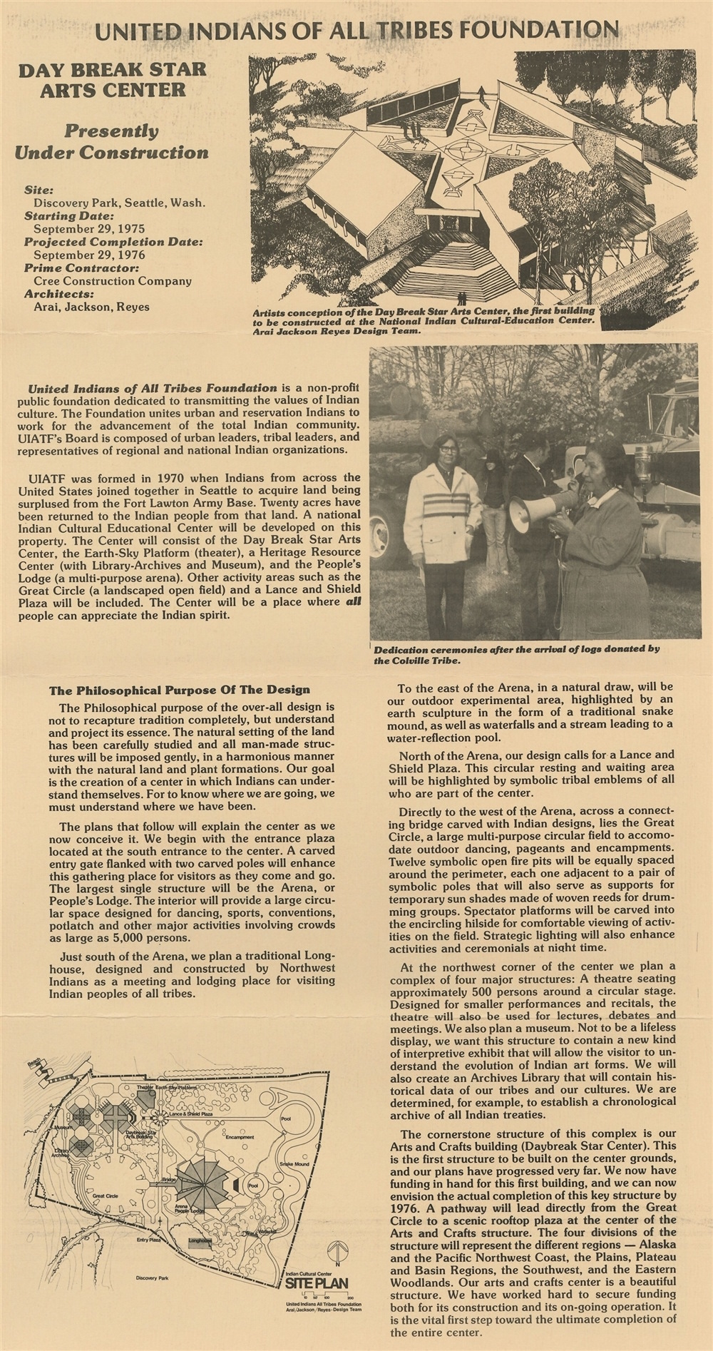 The UIATF contracted with the firm of Arai, Jackson, and Reyes for design services. Among the conditions of the negotiated agreement was a requirement that the UIATF present the city with a Master Plan detailing siting and construction elements for the leased area. This plan was submitted for the city's approval in May 1974, and approved by both the Seattle Design Commission and the Parks Board the following month. It explained that the center would include an arts and crafts facility, theater, library and archives, outdoor area and recreation field, longhouse, and "a large multipurpose arena." The first building scheduled for construction was the arts and crafts facility, named Daybreak Star. This was chosen as a priority by the UIATF partly due to the multipurpose nature of the space, and partly because revenue from the arts and crafts program was intended to provide a solid source of long-term economic support. Daybreak Star would serve as a "mini-center" until the remaining buildings would be constructed on a phased schedule yet to be determined. The plan outlined a site design and design philosophy, and explained the general purpose, goals and objectives for the center as a place for Native art and community that aimed to "develop and sustain the sense of Indian identity among Indian people."