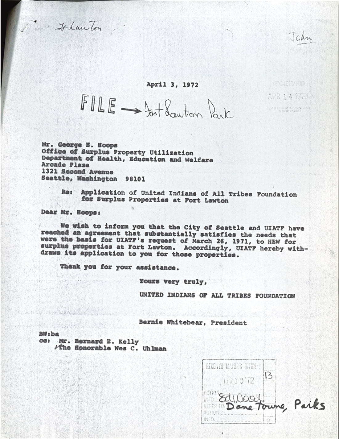 Mayor Uhlman replied to letters in favor of the UIATF claim by reiterating his strong support for developing the site as a park. "I believe that to divide the Fort Lawton land, or to give all of it to Indian groups would seriously restrict its public recreational development," he wrote. "However, I believe equity requires that all other interested groups - Indians included - should share in the planning of the recreational uses of the area. There is room, therefore, for Indian-oriented facilities and activities. But whatever the ultimate response, the response should come as a result of a planning process, not as a precondition to it."