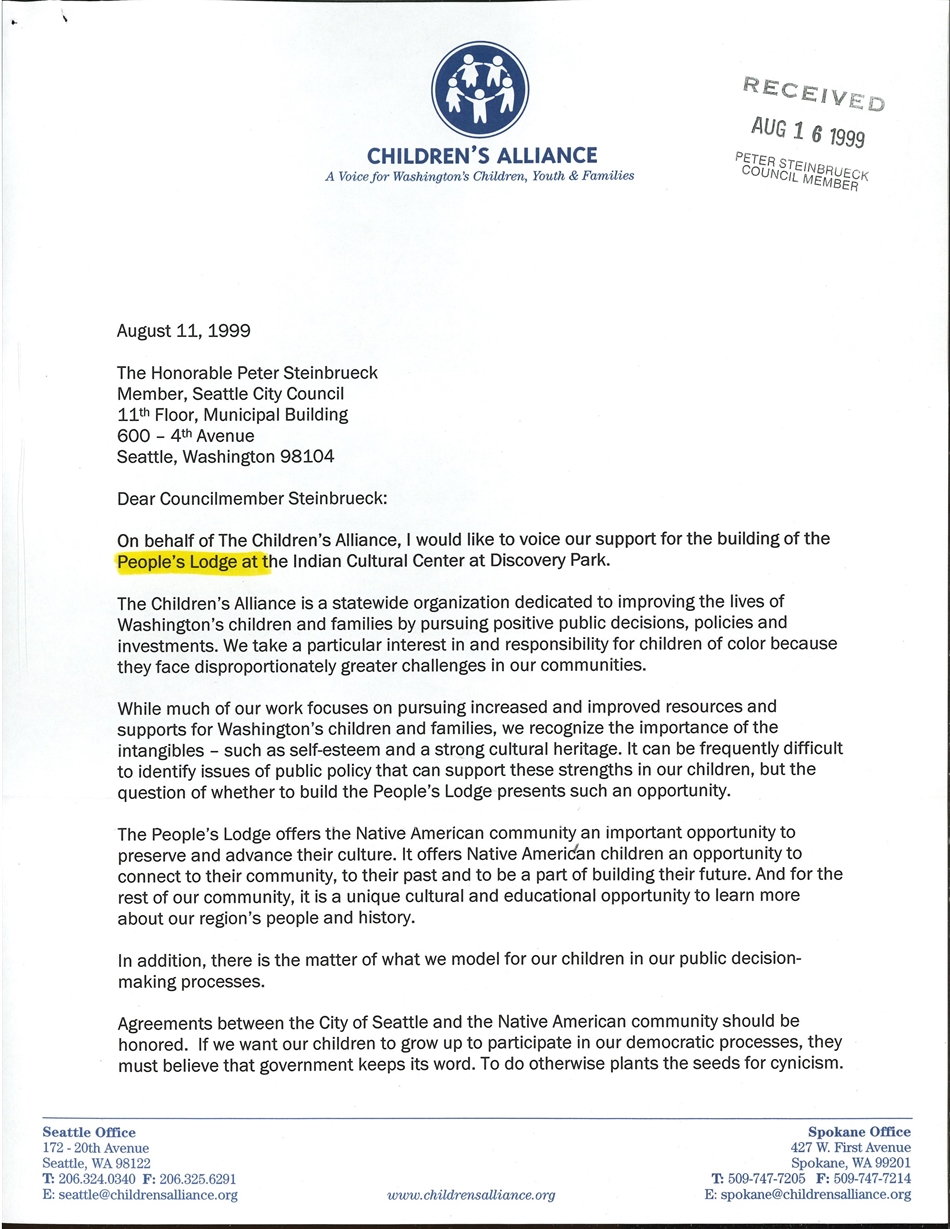 Friends of Discovery Park mobilized in opposition, and a new group called Coalition to Save Discovery Park formed in protest to the proposal. In a letter to Mayor Schell in May 1999, Bernie Whitebear defended the project against the coalition's "exaggerated rhetoric that has almost no factual basis." He outlined how the lodge was consistent with the original 1972 lease and agreement and approved by the city and author of the park's master plan, Dan Kiley. He also spoke to the frequent claim that to build the lodge would irrevocably disrupt the natural state of the park. "It is sadly ironic that some people claim that the Native American People's Lodge is going to harm the 'wilderness.' The wilderness left the beautiful bluffs of Magnolia 100 years ago and cannot possibly return in the middle of our urban metropolis. Discovery Park is no more pristine in Magnolia than Carkeek, Lincoln, or Seward Parks are in their neighborhoods." He further emphasized that open, tranquil space and a center for preserving, practicing, and learning about Native cultures "can easily exist side by side."