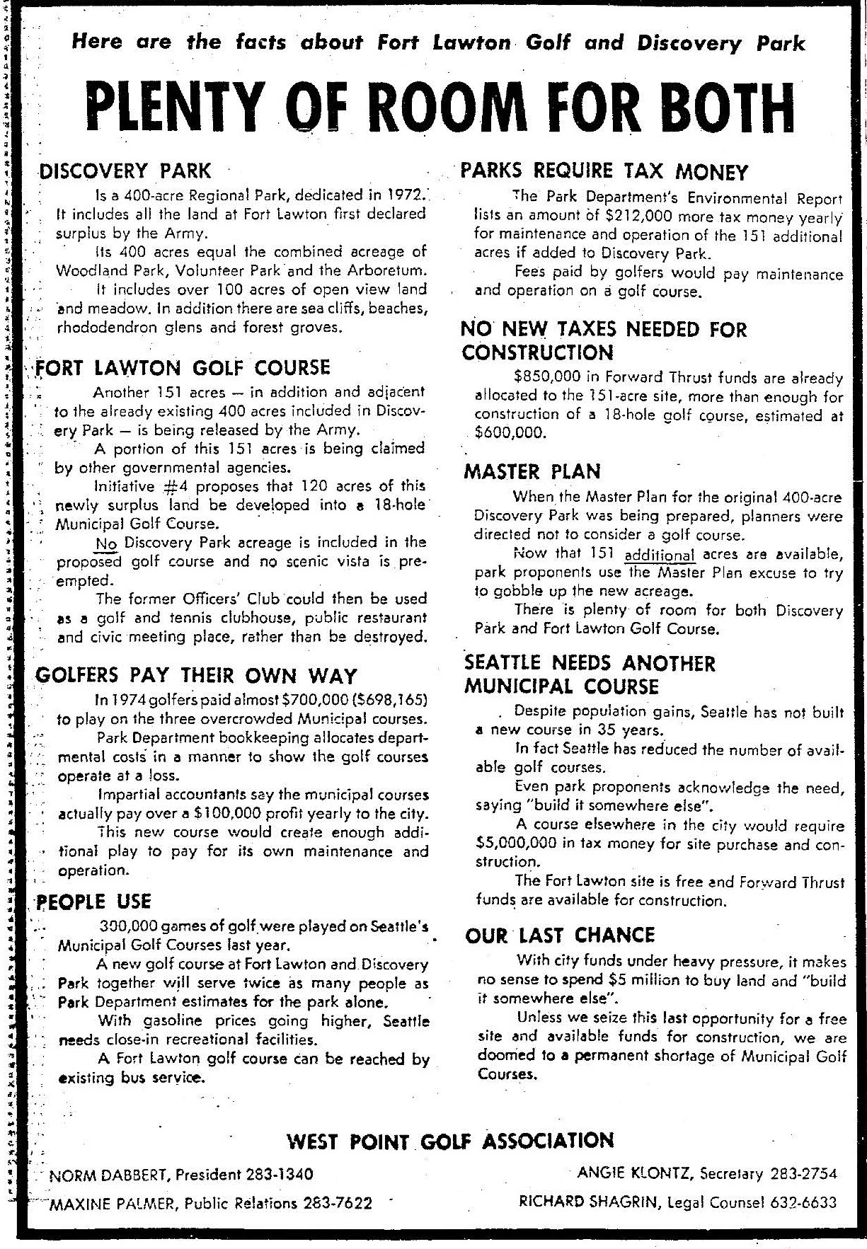 Developing a portion of the Fort Lawton land into a municipal golf course was proposed by golf enthusiasts as early as 1969, but the idea was ultimately rejected when the master plan was prepared and published in 1972. When the Army announced in 1974 that it would release another 151 acres of Fort Lawton, golf course proponents again proposed the idea of building a public golf course in the park. Two Magnolia residents, Norman Dabbert and Harry Watters, established the West Point Golf Association to promote and study the idea.