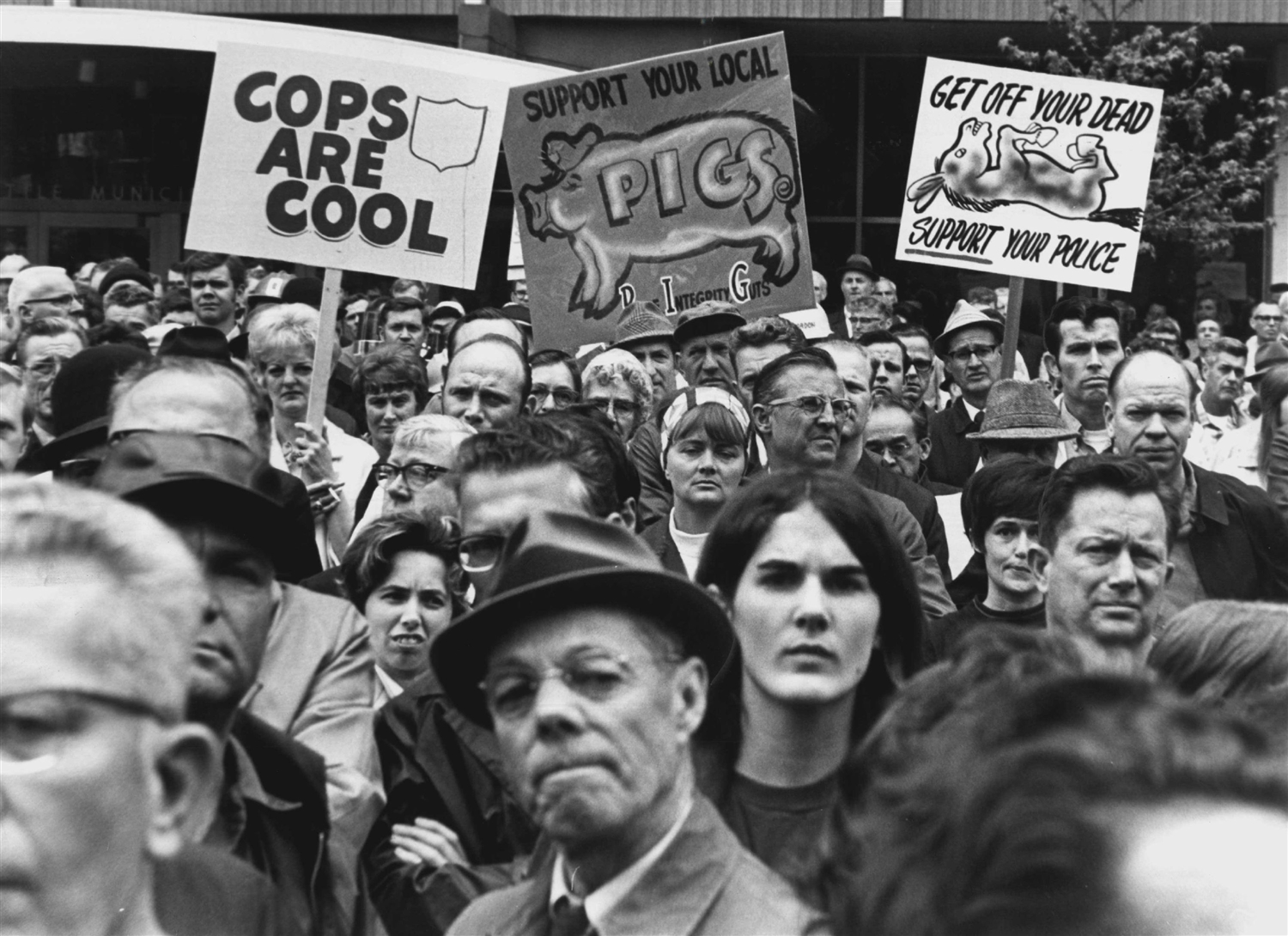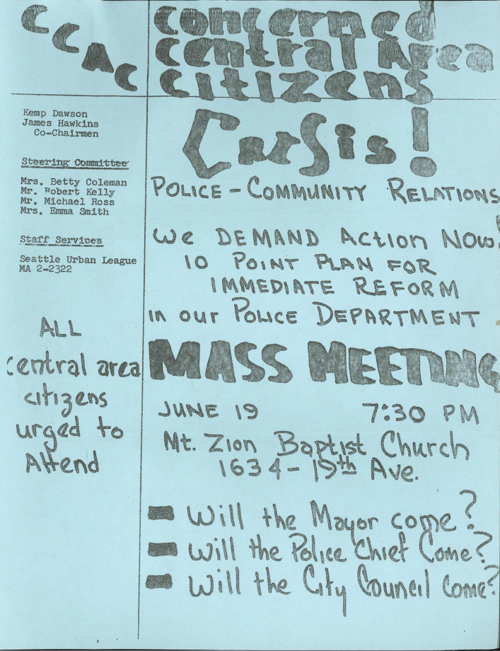 After complaints about police actions at a September 1969 demonstration at the University of Washington, the Human Rights Commission held public hearings and concluded that the police used excessive force. (The commission had been established in 1963 as a response to organized protests related to employment and housing discrimination.) They issued a report with recommendations including that all officers should have their name and badge number visible while on duty and that physical confrontations should not be initiated by police "except for strong and compelling reasons." The Seattle Police Officers Guild charged the commission with attempting to become a de facto police review board.