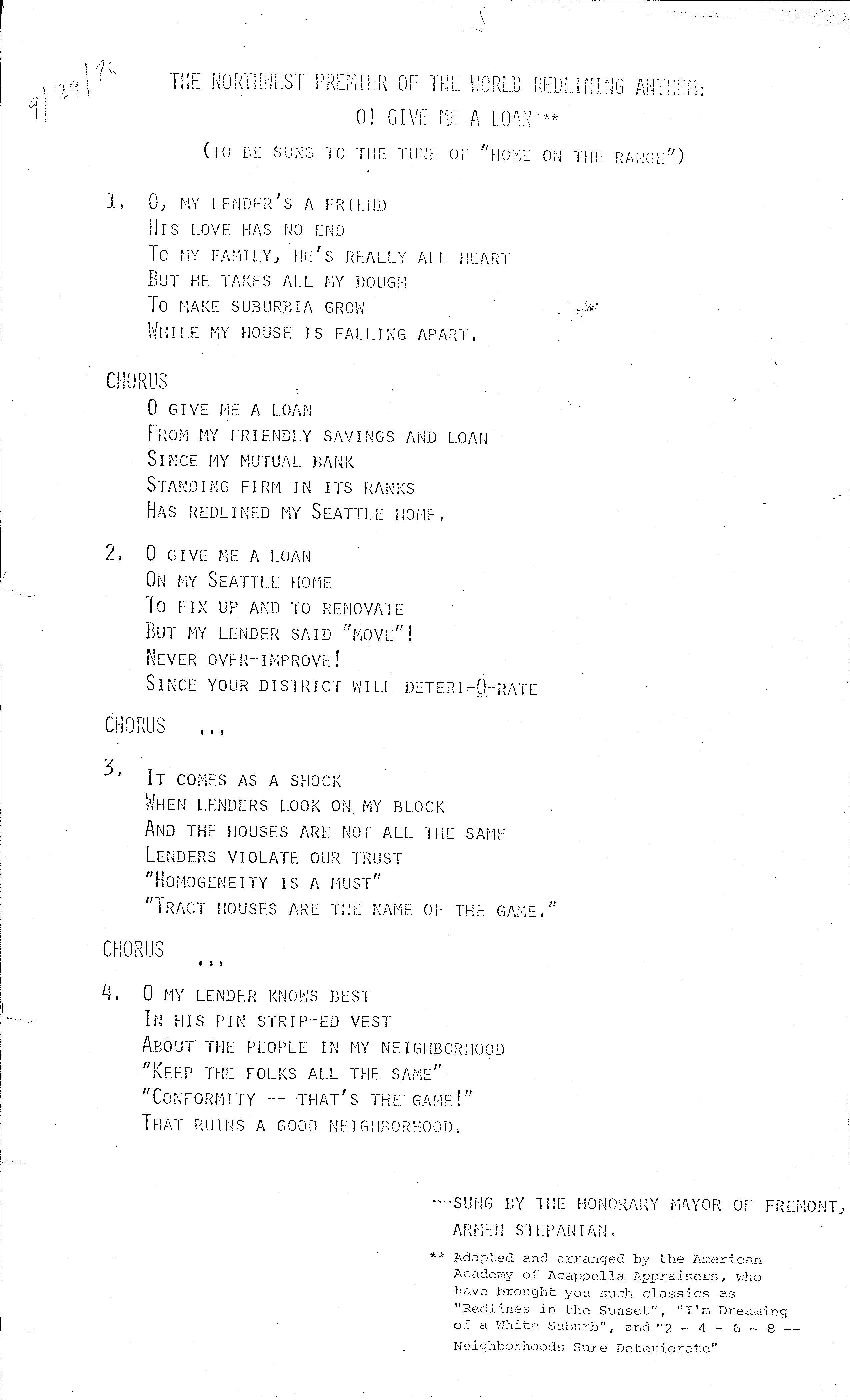 At a September 29, 1976, meeting of the City Council's Planning and Urban Development Committing regarding the lender review board, Armen Stepanian led Councilmembers Sam Smith and George Benson as well as a crowd of 150 in an anthem on redlining to the tune of "Home on the Range."