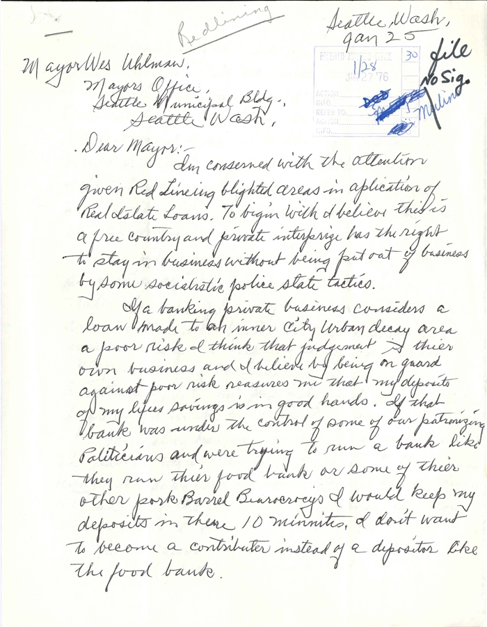In June 1977, Governor Dixy Lee Ray signed House Bill 323 prohibiting redlining. (Mayor Uhlman had lost his bid for governor in September 1976.) The House had approved the measure 84 to 4 and the Senate 29 to 11. The bill made it unlawful for a financial institution to deny or vary the terms of a loan because of the neighborhood the property is in, or to use lending standards with no economic basis.