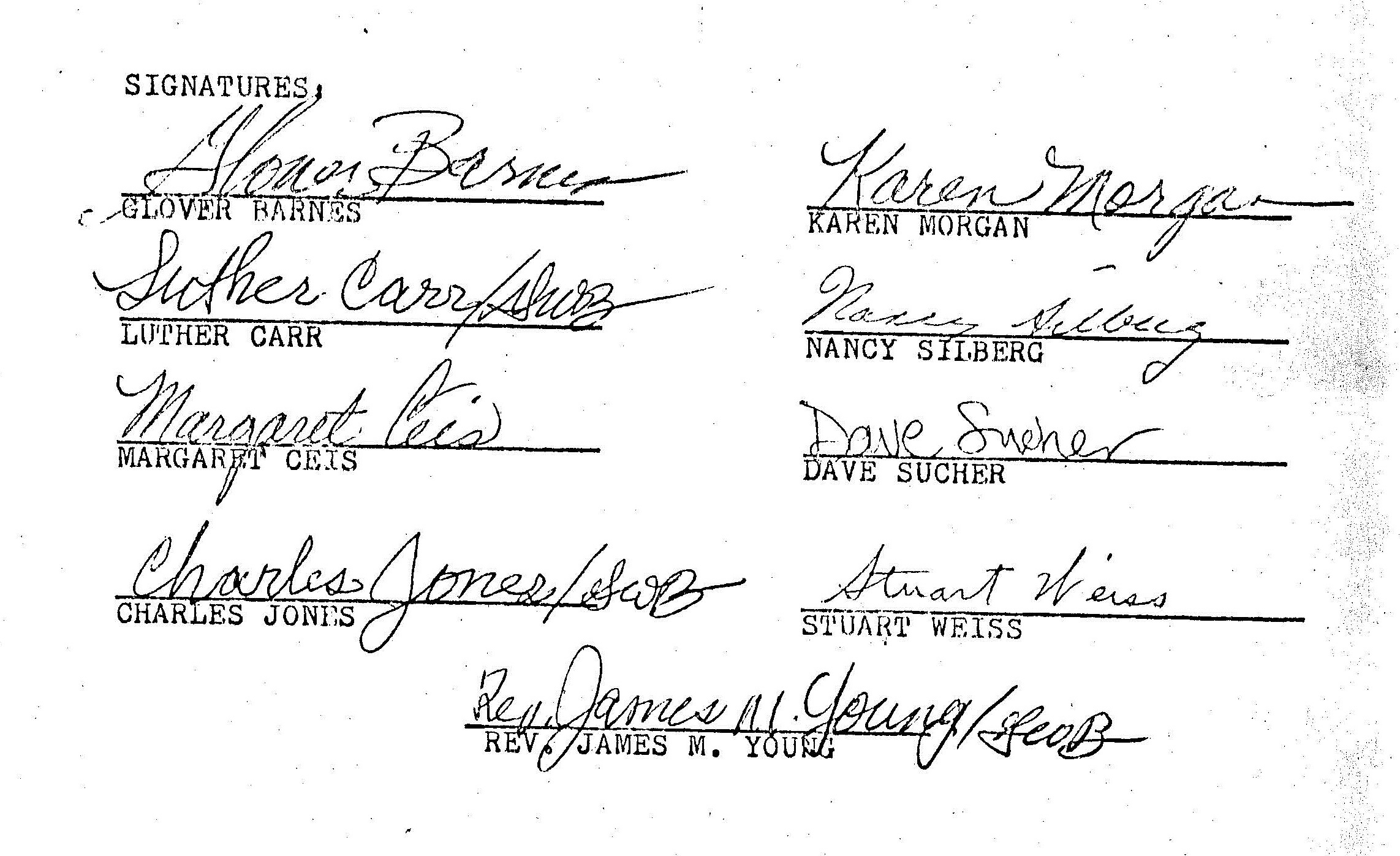 At a Task Force meeting on May 11, Margaret Ceis moved to delay the proceeding for two weeks so that the community members of the task force could meet separately and draft a position paper to counter the April 23 report of the lending institutions. The primary point of disagreement between the community members and the members from the banking community revolved around disclosure. The community members wanted to require banks to disclose where their deposits came from and where the loan dollars went, as well as information about loan terms and interest rates given home buyers in different geographical areas. The bankers did not agree with those suggestions. The motion to delay was voted down and the task force met without the community members. Those members, including Glover Barnes, Karen Morgan, Luther Carr, Nancy Silberg, Margaret Ceis, Dave Sucher, Charles Jones, Stuart Weiss, and Rev. James M. Young, submitted a separate report on June 3, 1976.