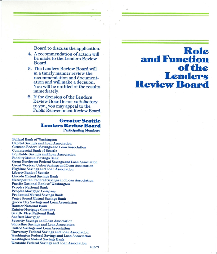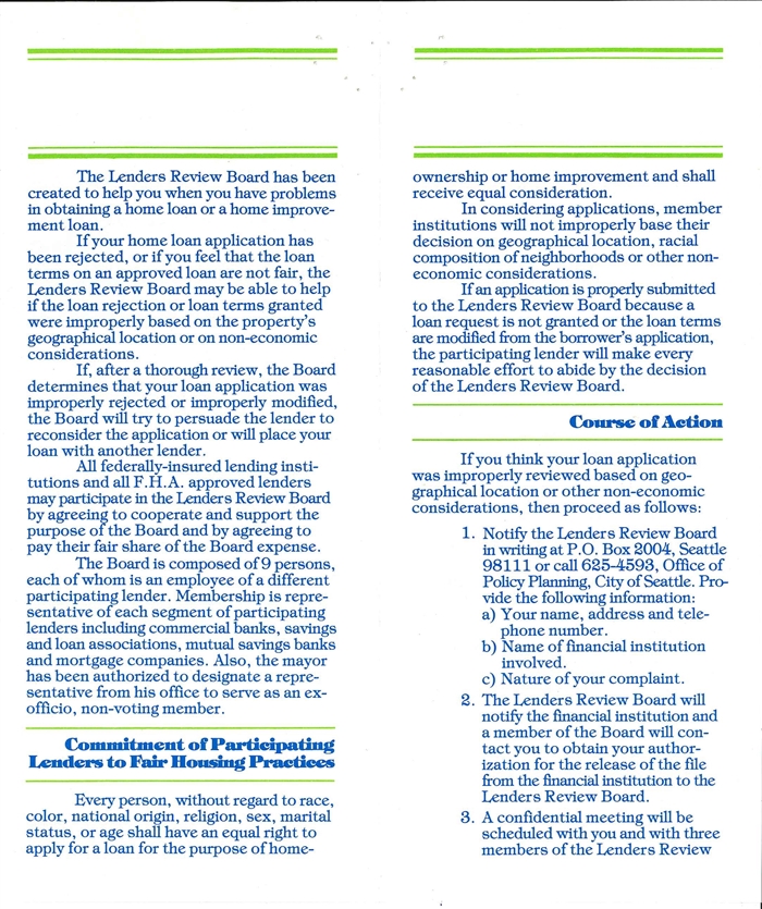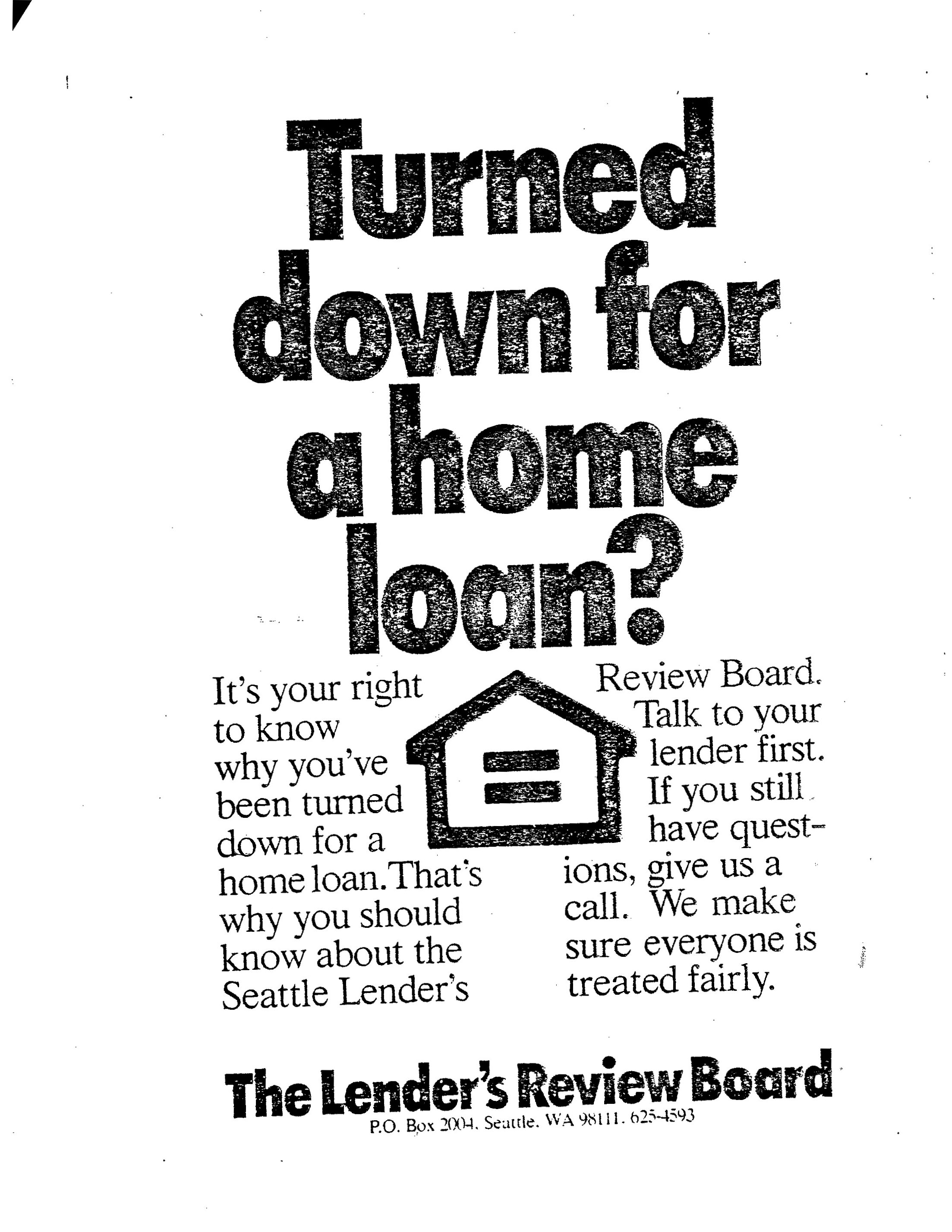 At the end of August, the Mayor announced the Seattle Residential Loan Review Process, enabling persons whose loan applications had been rejected by participating lenders to appeal before a Lenders Review Board (LRB). A voluntary agreement was made between eight lending institutions and the City, with members of the board selected from the participating institutions. The LRB would hear appeals from citizens who were denied loans.