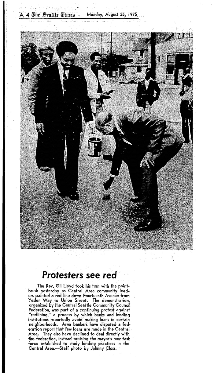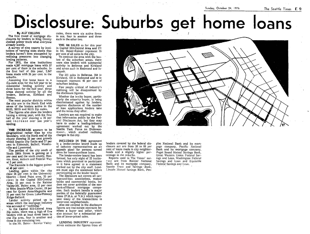 The report outlined redlining practices in the Central Area and Rainier Valley, stating that banks refused to lend money on properties that fell below a certain price, leaving homebuyers to go to a mortgage company for a loan. Mortgage companies charged more for a loan and foreclosed up to eight times more often on FHA loans than banks or savings and loan institutions. Ratios of deposits to loans in the Central branch banks was 24%, according to the report; in suburban branch banks the ratio was 97%. "Why should Central Area savings go to help the suburbs while our own neighborhoods slowly decay and die?" the report asked.