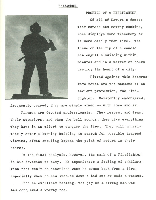 The 1962 annual report noted that "fire-fighting has much in common with military arts" and starting in 1963 the annual report listed firefighters as part of the Combat Division. When the Public Relations Unit was added to the Department in 1964, one of their first projects was to release a profile of a firefighter: members of an "ancient profession," the "mark of a fire fighter is his devotion to his duty." The feeling coming back from putting out a fire was described as "the joy of a strong man who has conquered a worthy foe."