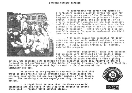 Mayor Wes Uhlman and Fire Chief Jack Richards exchanged correspondence in 1974 about bringing women firefighters into the Department. The City considered the possibility of using San Diego as a model; Chief Bell wrote from San Diego that its program was not successful as the first five females were terminated for "lack of required strength." Bell also warned Richards that in addition to the strength and agility issues, "You may also expect considerable reaction from your employees, their wives, and the public which quite probably will put you in a position of extreme criticism and condemnation regardless of what action you take....If you change any existing standards you will be charged with discrimination in favor of females, if you don't you will be discriminating against females."