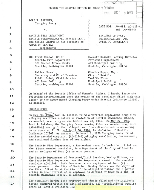 Three years after the suit was filed, the Office of Women's Rights found that there was reasonable cause to believe Lakshas had been discriminated against in physical and medical exams, evaluation of a wrist injury and removal from disability status. But not until eight years later, in 1984, did the Department of Human Rights find the charge of sex discrimination to be true. The City awarded Lakshas $40,000 for back pay, legal fees, and interest.
