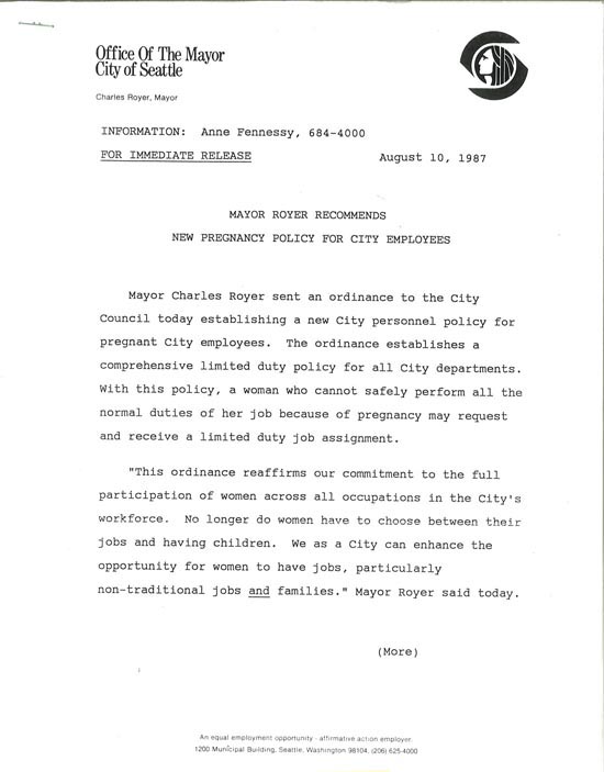 The ordinance guaranteeing light duty for pregnant City employees in non-traditional jobs was passed with a sunset clause which did not allow the ordinance to become final until it was established that no unanticipated costs or problems arose and that the policy worked smoothly. After three years, in 1990, the sunset clause on the ordinance was removed.