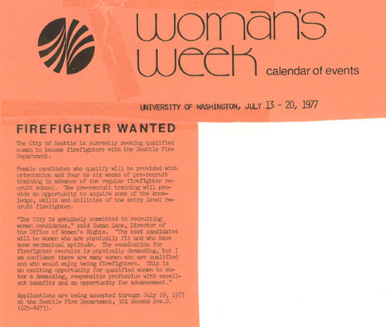 City Council Member Jeanette Williams, as head of the Human Resources and Judiciary Committee in the 1970s, was acutely aware of affirmative action issues. In 1974, Williams responded to a Seattle Post-Intelligencer article that questioned the attitude of some in the Fire Department towards women, and asked the Office of Women's Rights to propose "that some type of procedure be set up to check up on this attitude problem...."
