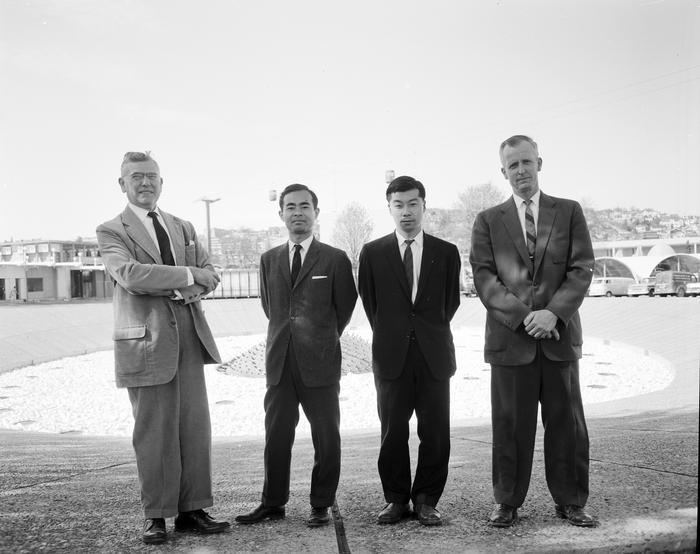 One silent home movie by an unknown creator, donated to the City of Seattle, records the opening ceremony on April 21, 1962. Footage includes a train arriving at King Street Station, greeted by the Seattle Buddhist Church’s Buddhist Scouts Drum and Bugle Corps and baton twirlers, speeches at the Plaza of the States and a performance of the Coast Salish tribes.