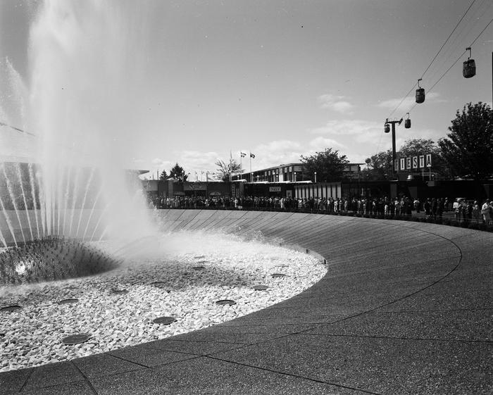 On May 10, 1962, not long after the Fair opened, the consulting engineers Valentine & Fisher wrote to City Council with a concern: children playing on the fountain. "The kids are playing 'Fountain Roulette' with the International Fountain. This sort of thing was never intended to be allowed and someone is likely to be severely injured eventually... We recommend that an ordinance be enacted immediately making trespassing upon the white rock area by any unauthorized person a violation of city ordinance."