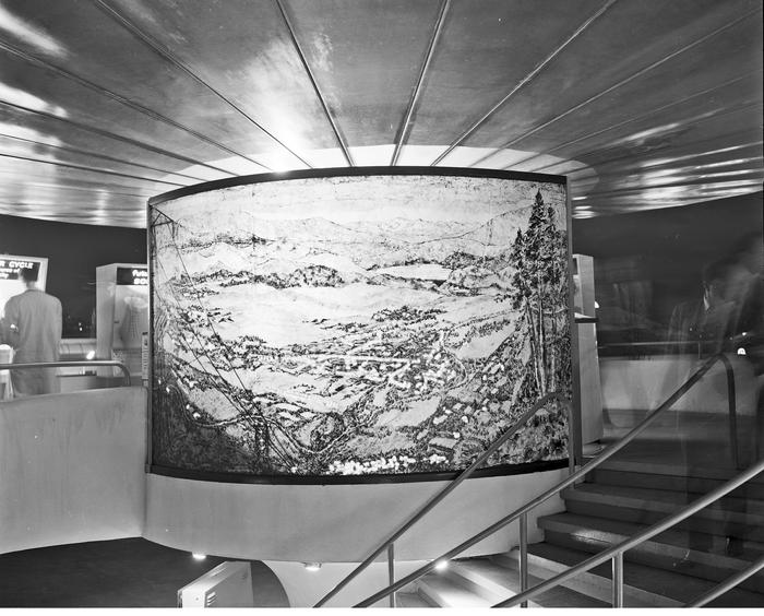 The relief map used electricity to illustrate how electricity was generated. The map was installed on March 30, in plenty of time. Visitors could look down on the electrified map from the ramp to the Pavilion. A mural was also installed inside the Pavilion and lit from behind. In addition to illustrative panels about water as an energy source, the Pavilion also displayed information about future power from solar and atomic energy.
