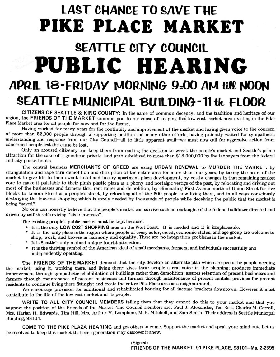 Although plans for urban renewal projects were often modified versions of what was originally envisioned, for the most part the projects in Seattle were implemented. One notable exception was the urban renewal plan for Pike Place Project, which called for demolishing the Market and replacing it with high-rise buildings and a 7-story parking garage. The plan had the support of the Mayor, City Council, and the business community, but citizens across the city rose in opposition. A group called Friends of the Market was formed and sponsored an initiative to establish a historic district around the Market, ensuring it would be rehabilitated and preserved. The initiative passed by a 3-to-2 margin.