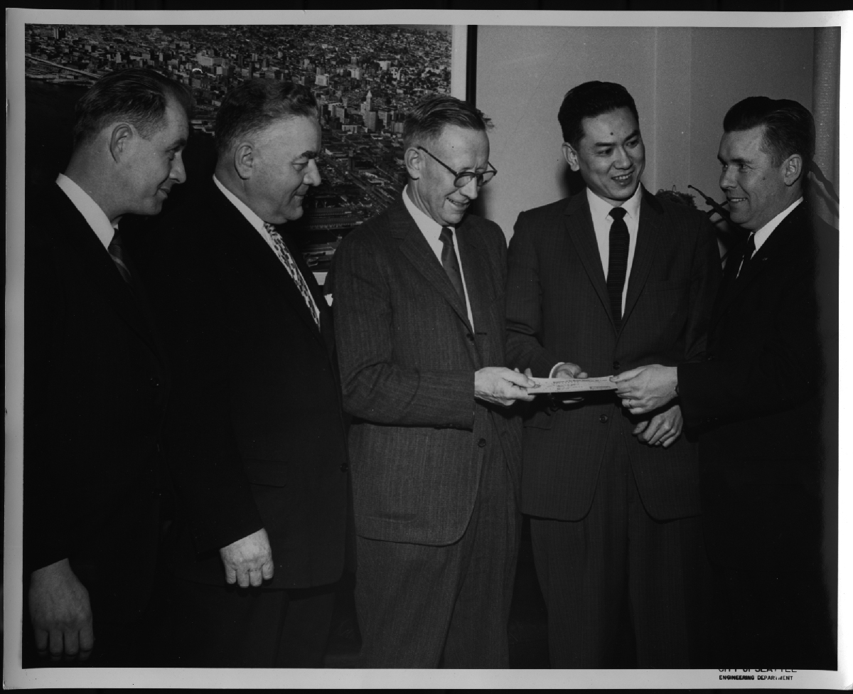 Mayor Clinton receiving check for first federal advance of Urban Renewal Funds, 1960