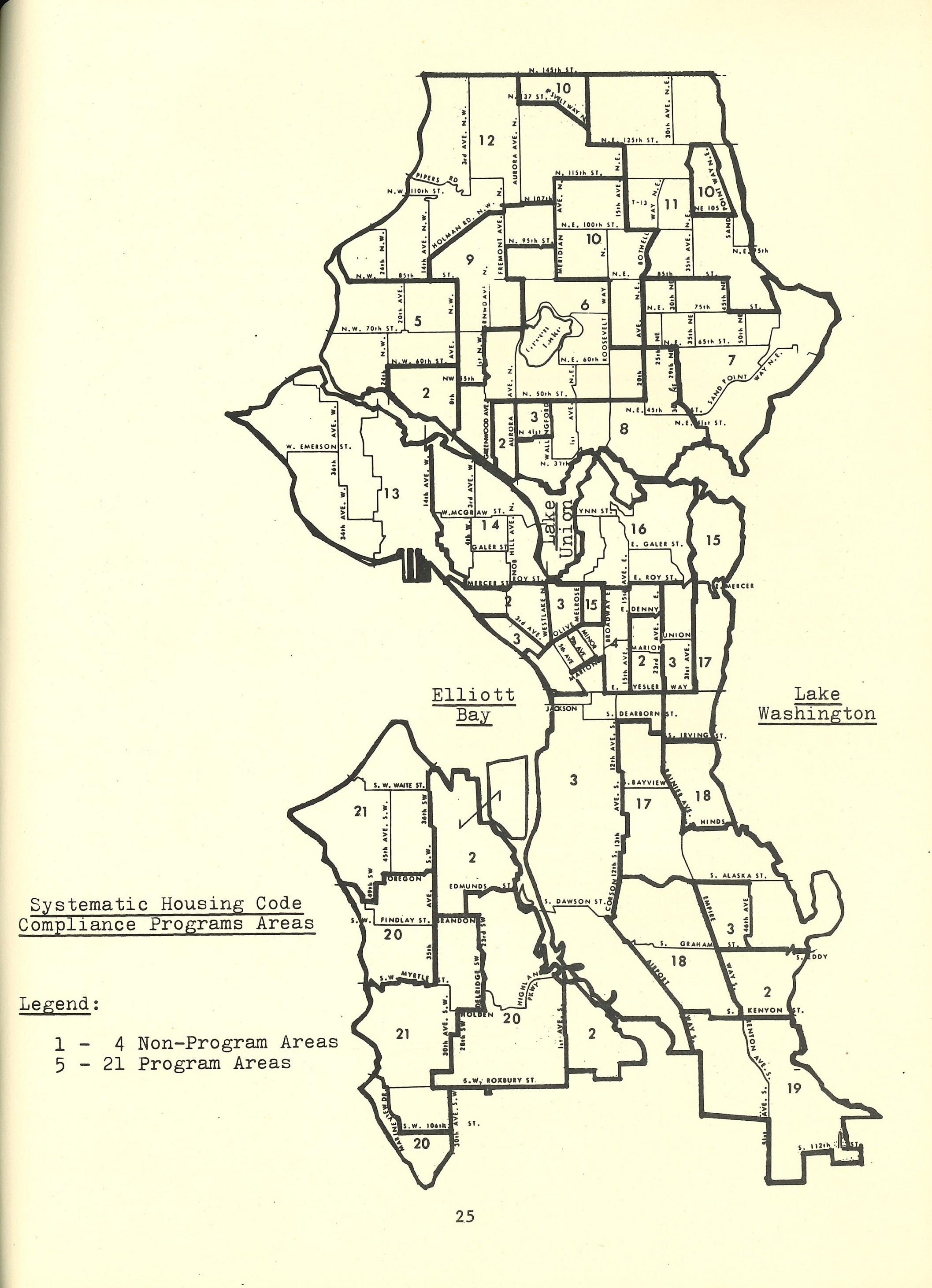 Seattle's first minimum housing code was passed with Ordinance 88069 in March 1959, establishing "minimum housing standards for the protection of the public health, safety, morals and the general welfare in buildings used for human habitation in the City of Seattle." A revised code with stronger rules and penalties was passed the following April. In addition to setting rules, the housing code authorized the City to require the repair, closure, or demolition of buildings found to be noncompliant. Described in the 1962 Workable Program as "the City's essential tool for the prevention of the spread of blight," code enforcement was a consistent element throughout urban renewal efforts in Seattle.