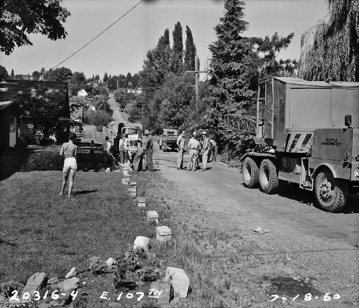 Paving, sewer construction and repair, and bridge planning and construction projects are documented in Engineering and Board of Public Works records. For example, Miscellaneous Improvement Records from the Engineering Department include files on Northgate Way paving, water main and hydrant installations for Ashworth Ave N., and Thornton Creek storm drain repairs.