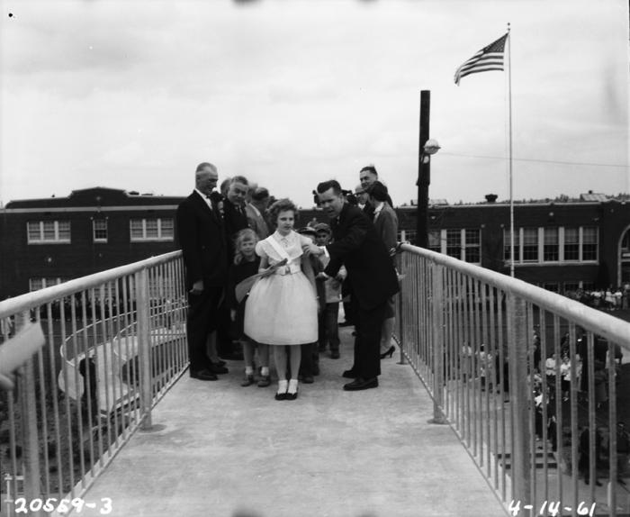 The Oak Lake School, formed in 1885 at 100th St. and Aurora Ave. N., served children as far north as the Snohomish County line and as far east as Lake Washington. Engineering Department negatives show a proposed pedestrian overpass from 1960 through completion and dedication of the project in 1961. The Oak Lake School was demolished in 1985 and is now the site of the Oak Tree Village.