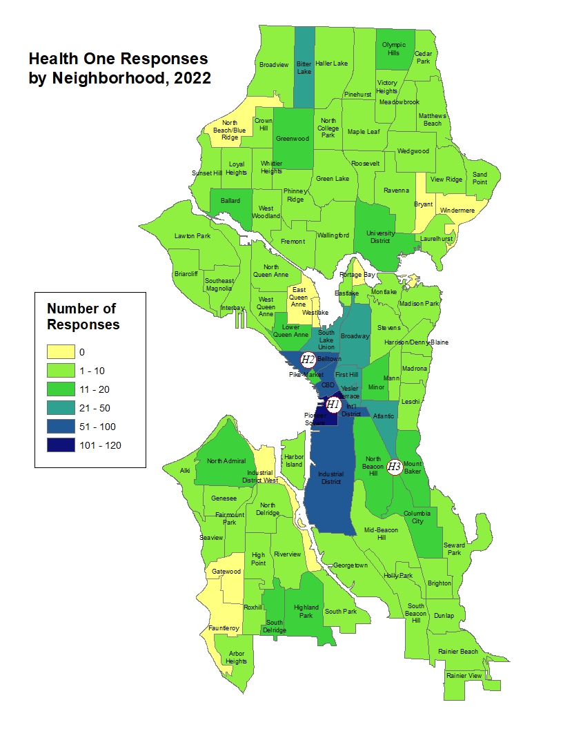 Within the city, Health One emphasizes several neighborhoods as a function of call volume, equity, or access to services. These focus areas include the downtown core, Pioneer Square, Chinatown/ID, Capitol Hill, SODO, the Central District, Ballard, the University District, and Southeast Seattle.
