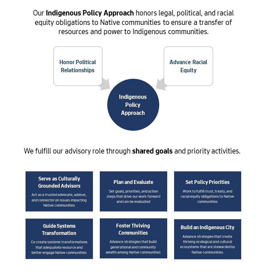 The Indigenous Advisory Council advises the Mayor, City Council, and City departments on policies, budgets, programs, services, and projects directly affecting Indigenous populations including American Indian, Alaska Native, and Native Hawaiian people. The City of Seattle's government-to-government relationship with Tribal Nations continues to be fulfilled by the Office of Intergovernmental Relations.
