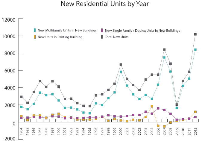 - Residential construction permits: Seattle is experiencing high volumes of residential permits with historic highs of residential units in the permit pipeline for 2012. View the new residential unit graph.
