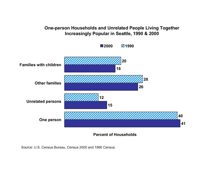 Seattle was unusual for its high proportion of one-person households. This type of household was more common in Seattle than it was in the county, state, or in the nation. Two of every five Seattle households is home to just one person – 41 percent, up slightly from 40 percent in 1990.