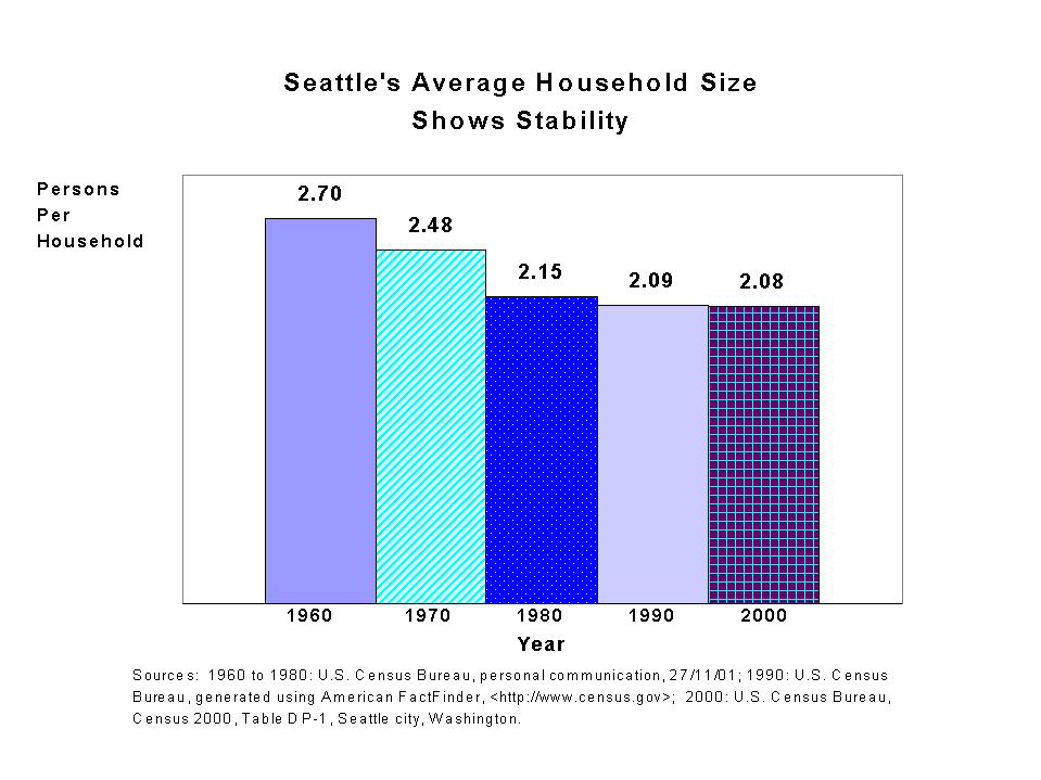 Between 2000 and 2010, the average number of persons per household in Seattle declined from 2.08 to 2.06. This slight decline continues a long term trend toward smaller household sizes, both locally and nationally.