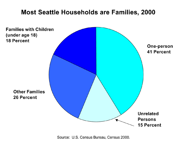 About 13 percent of Seattle’s households are husband-wife married couples with children. Another 6 percent of Seattle households are other families with children. These figures on family households with children refer to households in which there is at least one child under 18 years of age who is related to the householder.