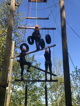 - Trapeze Jump/Leap of Faith: Climb a telephone pole and leap for a trapeze. Great for personal goal setting with group support. There are critical support roles for participants without leaving the ground.