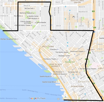 The downtown core (see map below) is the area bounded by Denny Way to the north, Yesler Way to the south, the Elliott Bay waterfront to the west, and Interstate 5 to the east, and the area bounded by Roy Street to the north, Denny Way to the south, 1st Avenue North to the west and Aurora Avenue North to the east.