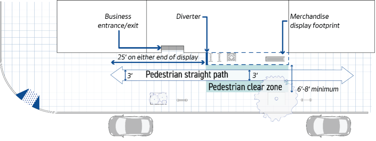 - Sited to provide an unobstructed 3-foot-wide pedestrian straight path within the designated pedestrian clear zone that extends along the permitted area and for 25 feet on either end of the permitted area's boundaries along the block face. The straight path runs along the display's boundaries and must be a continuous straight route that indicates the path of travel and parallels the curb. See this figure above for an illustration of the pedestrian straight path.