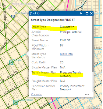 - You can find out if your location requires this additional space by using the Streets Illustrated Street Type Map. Navigate to your location and then click on the street. You’ll find a pop-up box that will show you the needed information (Street Type for Downtown or Downtown Neighborhood Streets, Transit Master Plan for Frequent Transit Network, and Urban Village P-Zone for pedestrian-designated zones), see examples in this figure, which shows the first pop-up box.