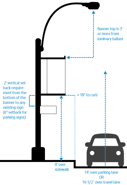 - If banner is on sidewalk side of pole, make sure it is at least 8 feet above the sidewalk and 18 inches back from the face of the curb